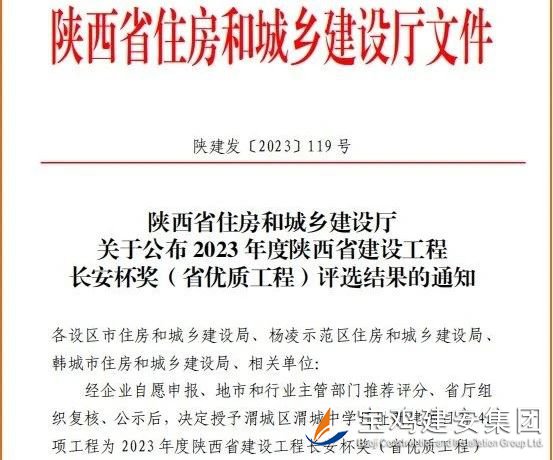 近日,陜西省住房和城鄉(xiāng)建設(shè)廳《關(guān)于公布2023年度陜西省建設(shè)工程長(zhǎng)安杯獎(jiǎng)(省優(yōu)質(zhì)工程)評(píng)選結(jié)果的通知》正式下發(fā),公司承建的中共寶雞市委黨校遷建工程榮登金榜,為集團(tuán)再添一項(xiàng)陜西省建設(shè)工程“長(zhǎng)安杯”獎(jiǎng)。